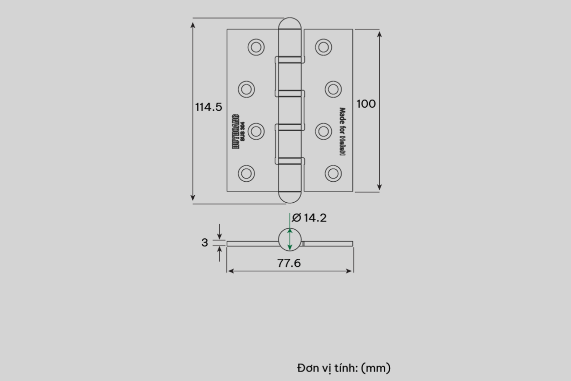 – Sản phẩm được sản xuất bằng vật liệu INOX 304 dày 3mm, được gia công chính xác trên các thiết bị chuyên dùng hiện đại, đảm bảo cho bản lề có độ dơ lắc nhỏ nhất. Núm được bọc bằng inox.