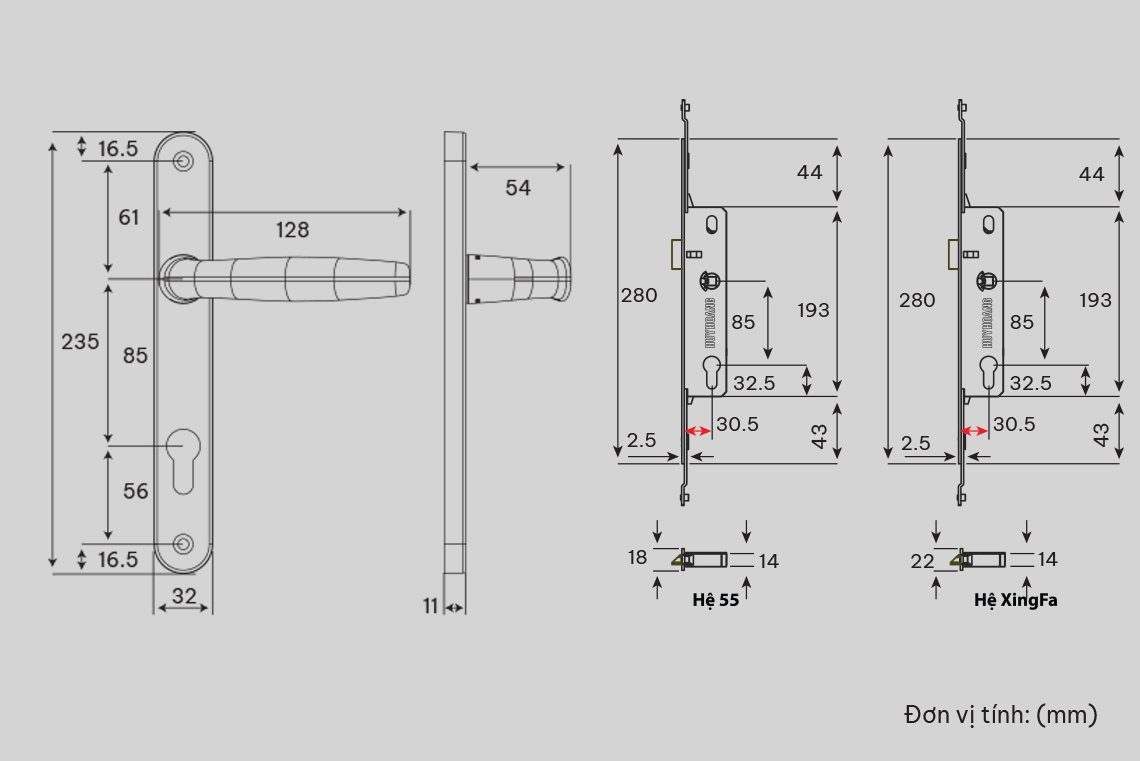Sản phẩm khóa tay nắm TNAPDDHCX66: có 2 phiên bản thân phù hợp với các loại nhôm hệ thông dụng như Hệ 55, Hệ XingFa…và 2 phiên bản ốp phụ phù hợp cho các loại cửa 1 cánh hoặc 2 cánh.