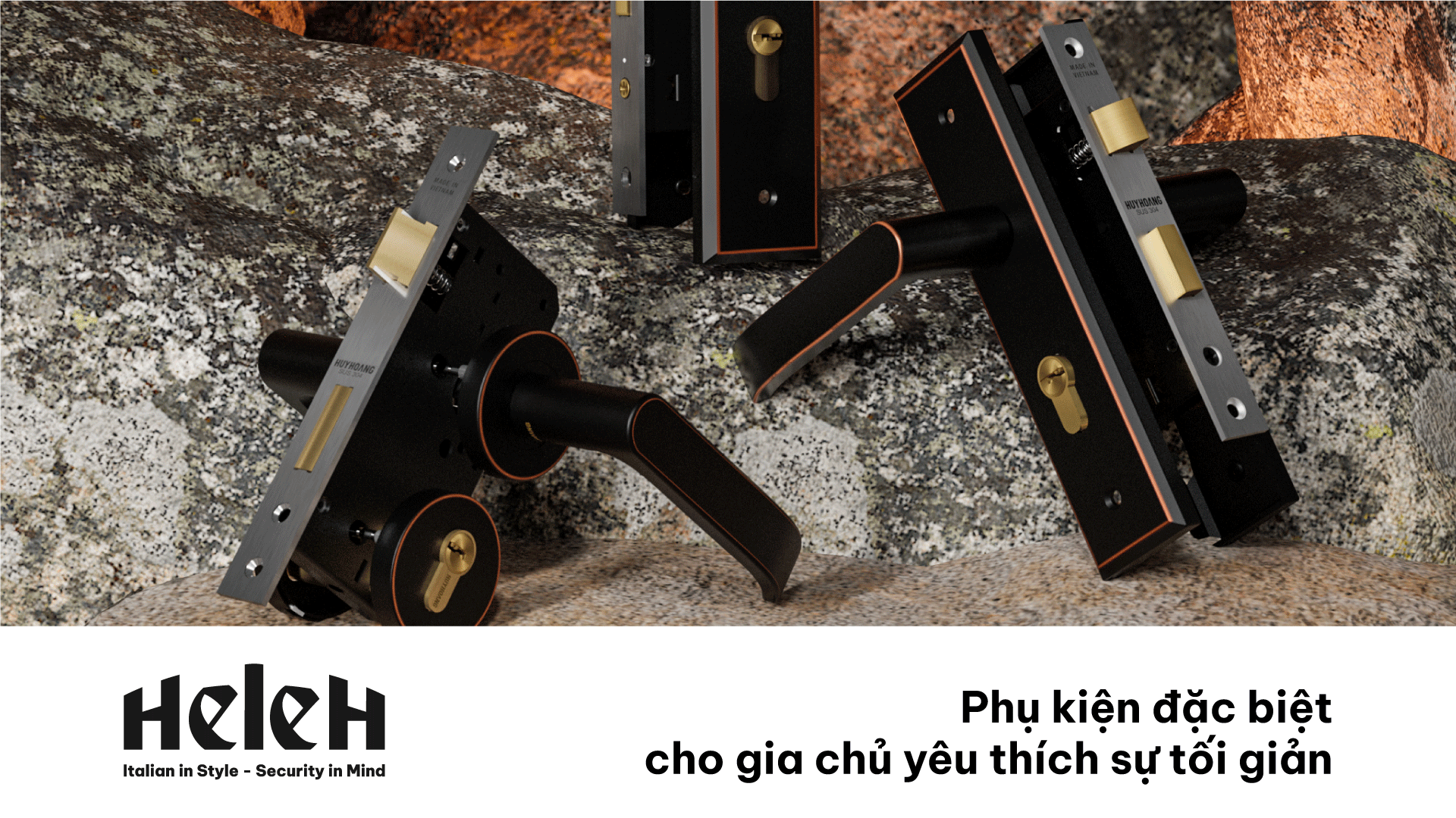 Set khóa mạ đồng đen trong BST Minimalism của HeleH thuộc dòng sản phẩm cao cấp, từng chi tiết được trau chuốt tỉ mỉ, đảm bảo từ chất lượng tới thẩm mỹ. Bộ sản phẩm có phần tay ốp khóa được sản xuất bằng vật liệu Inox 304 và mạ màu đen viền đồng (Đồng đen American) rất độc đáo và hiện đại.